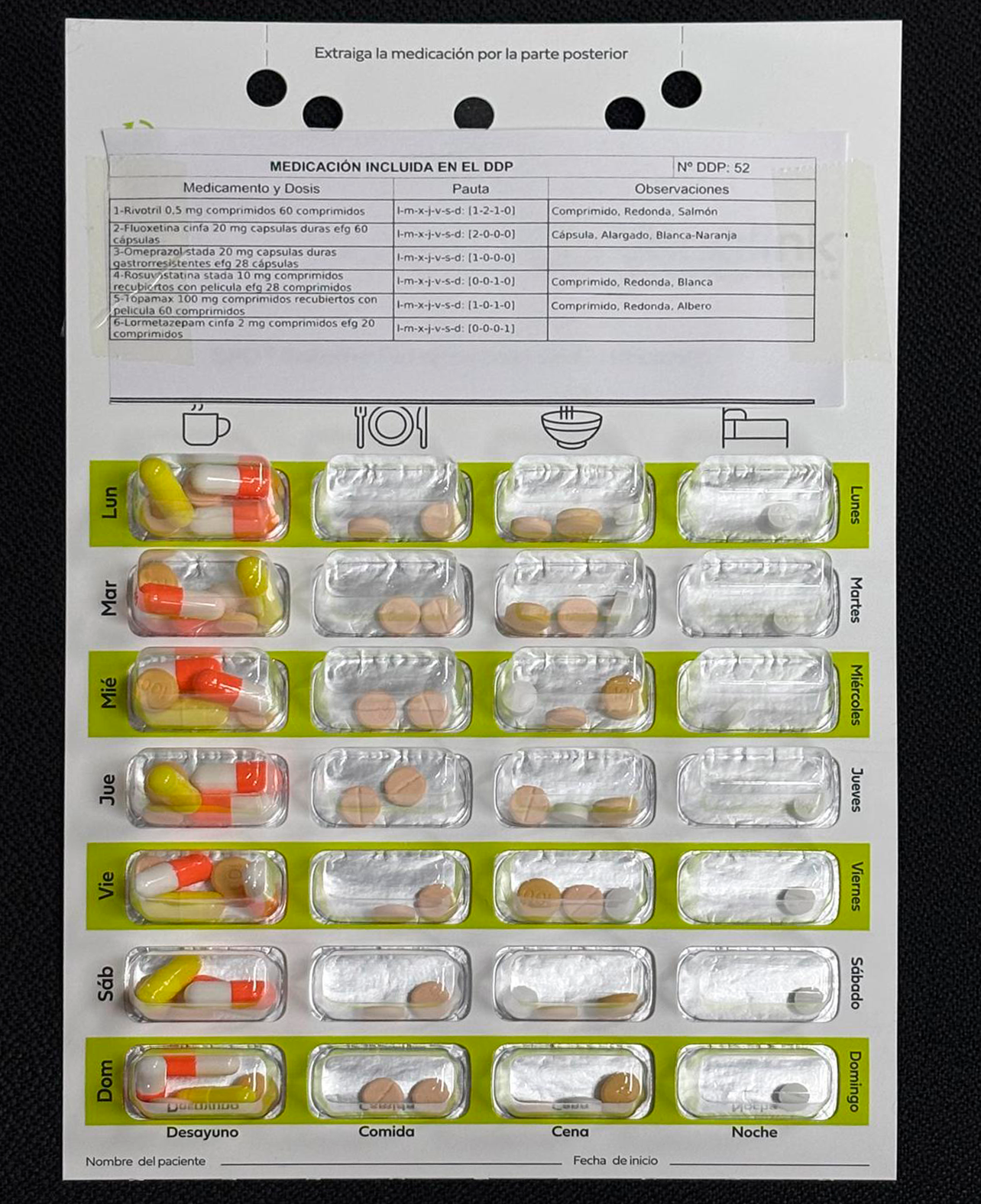 Este sistema permite al paciente identificar claramente qué medicamentos debe tomar y cuándo, evitando errores, olvidos o duplicidades.